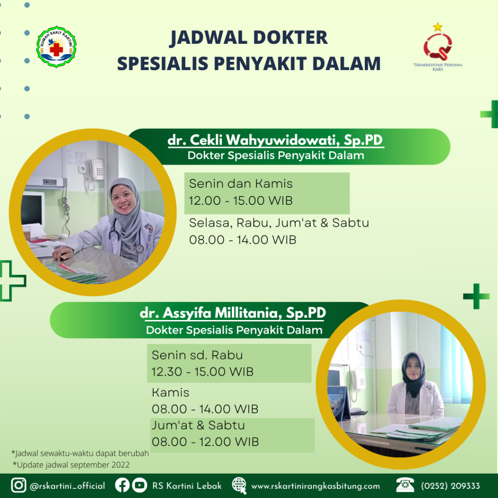 Jadwal Dokter Spesialis Penyakit Dalam dr. Cekli Wahyuwidowati, Sp.PD dan dr. Douglass, Sp.PD